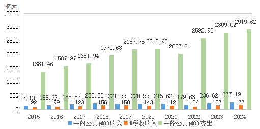 全年全区一般公共预算收入277.19亿元,比上年增长17.1%。其中,税收收入176.52亿元,增长12.8%。一般公共预算支出2919.62亿元,增长3.9%。